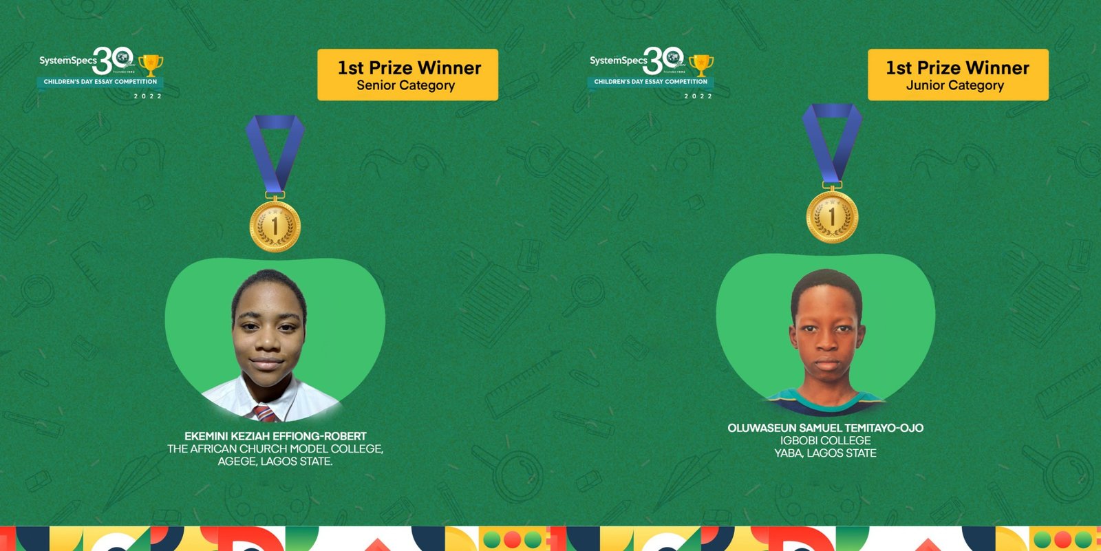 11-year-old Oluwaseun Samuel Temitayo-Ojo of Igbobi College, Yaba, Lagos and 15-year-old Ekemini Keziah Effiong-Robert of the African Church Model College, Agege, Lagos, have emerged winners in the junior and senior categories, respectively, of the 30th-anniversary edition of the annual SystemSpecs Children’s Day Essay Competition (CDEC).